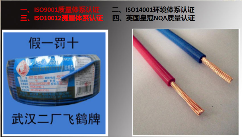 體系認證、 ISO14001環(huán)境體系認證、ISO10012測量體系認證。“飛鶴”線纜先后在湖北省電力公司、三峽工程、西電東送、奧運工程、武漢輕軌、本田汽